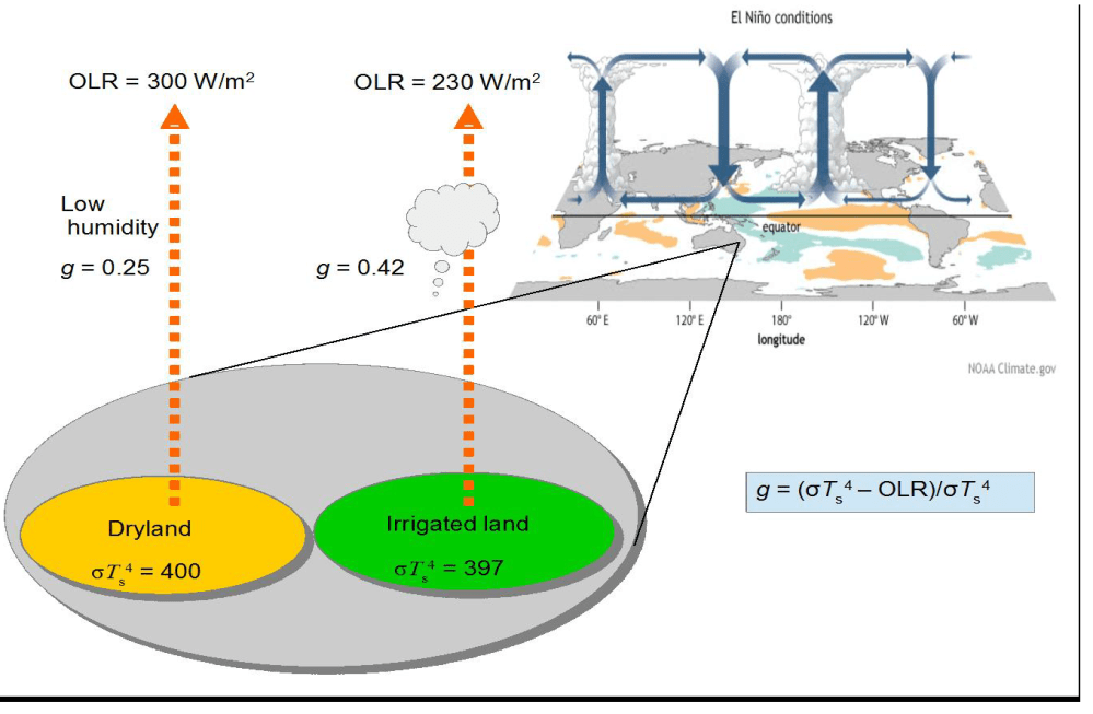 Fig. 4 Comparison of dryland and irrigated land for effect of water on heat retention in the atmosphere as an enhanced greenhouse effect. The El Nino condition of enhanced evaporation from the ocean known to strongly reduce OLR In [3] is shown as an analogue.