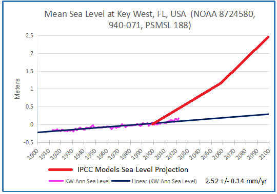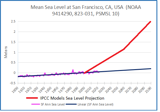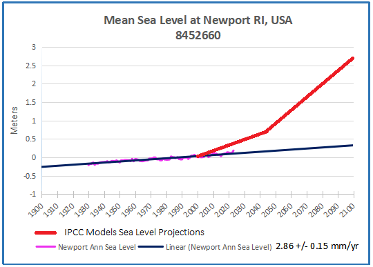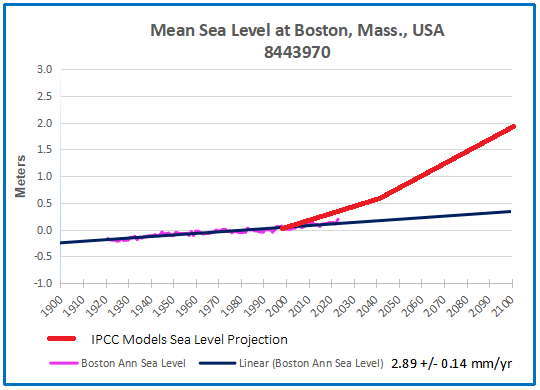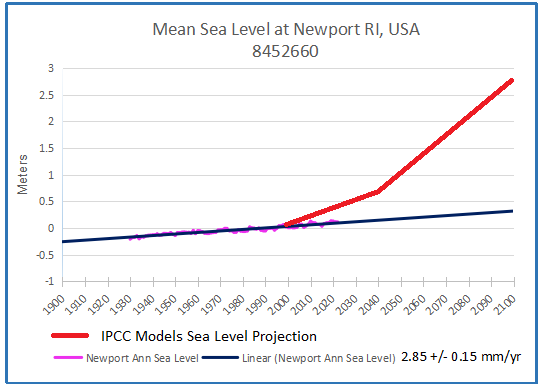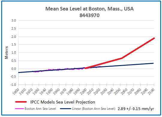 [Note: Some readers may be confused by the imagined sea level projections shown in red. These come from models that include IPCC suppositions in estimating sea level rise in various localities. For example, from the UCS (Union of Concerned Scientists):