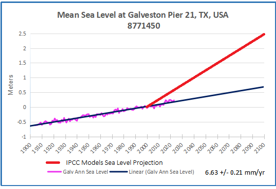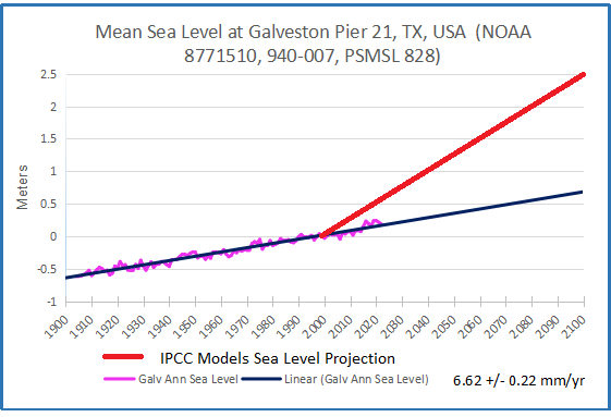 Already the imaginary rises are diverging greatly from observations, yet the chorus of alarm goes on. In fact, the added rise to 2100 from tidal gauges ranges from 6 to 9.5 inches, except for Galveston projecting 20.6 inches. Meanwhile models imagined rises from 69 to 108 inches. Clearly coastal settlements must adapt to evolving conditions, but also need reasonable rather than fearful forecasts for planning purposes.