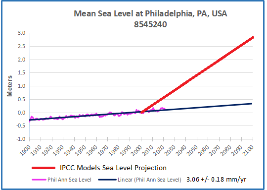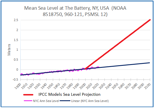 Summary: This is a relentless, high-tech communications machine to raise all kinds of scary future possibilities, based upon climate model projections, and the unfounded theory of CO2-driven global warming/climate change. The graphs above are centered on the year 2000, so that the 21st century added sea level rise is projected from that year forward. In addition, we now have observations at tidal gauges for the first 23 years, nearly 1/4 of the total expected. The gauges in each city are the ones with the longest continuous service record, and wherever possible the locations shown in the simulations are not far from the tidal gauge. For example, NYC best gauge is at the Battery, and Fulton St. is also near the Manhattan southern tip.