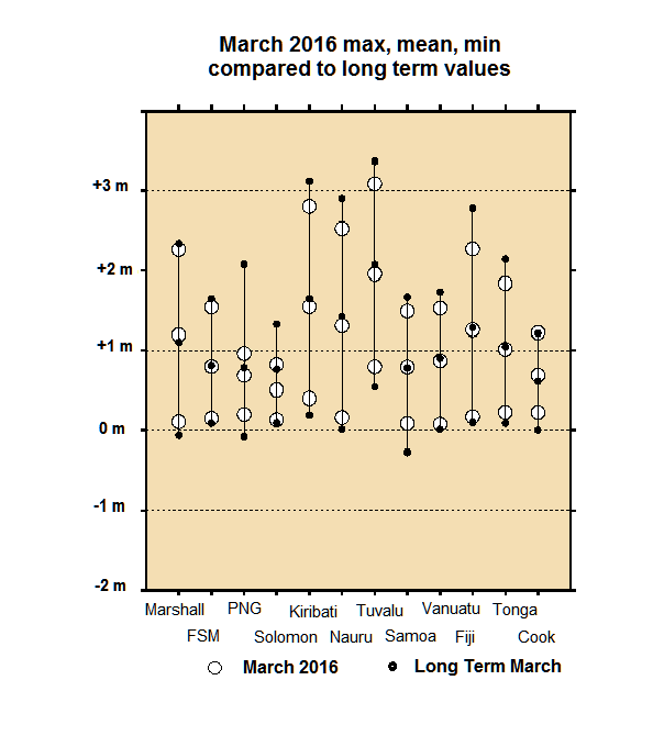 In the Monthly reports are graphs showing results of six minute observations, indicating tidal movements daily over the course of a month.The chart above shows how sea level varied in each location during March 2016 compared to long term March results. Since many stations were installed in 1993, long term means about 22 years of history.