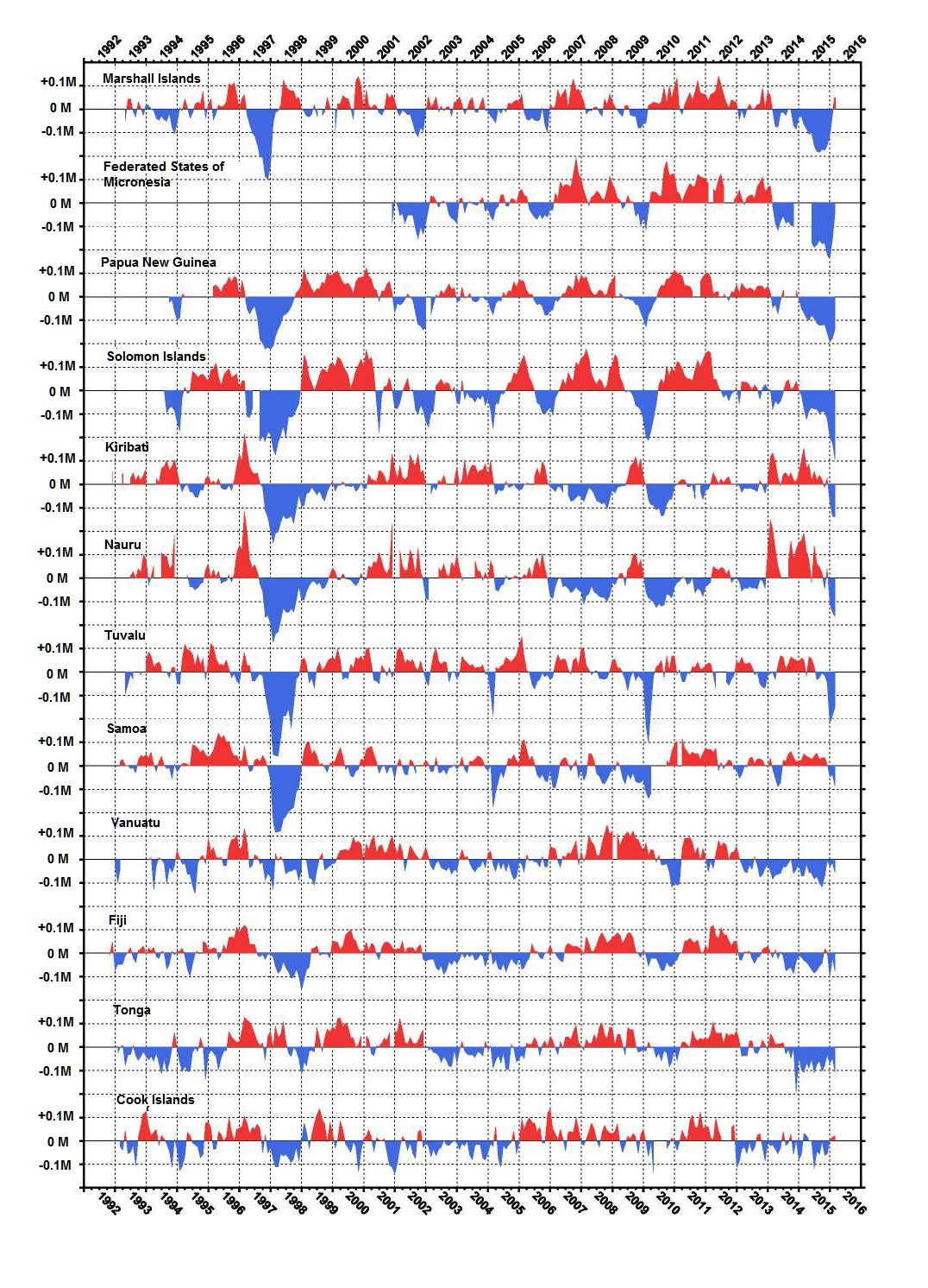 Looking into the details of the monthly anomalies, it is clear that sea level changes at the mm level are swamped by volatility of movements greater by orders of magnitude. And there are obvious effects from ENSO events. The 1997-98 El Nino shows up in a dramatic fall of sea levels almost everywhere, and that event alone creates most of the rising trends in the table above. The 2014-2016 El Nino is also causing sea levels to fall, but is too recent to affect the long term trend.