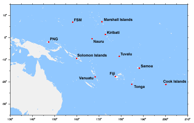 The 14 Pacific Island countries now participating in the project provide a wide coverage across the Pacific Basin: the Cook Islands, Federated States of Micronesia, Fiji, Kiribati, Marshall Islands, Nauru, Niue, Palau, Papua New Guinea, Samoa, Solomon Islands, Tonga, Tuvalu and Vanuatu.