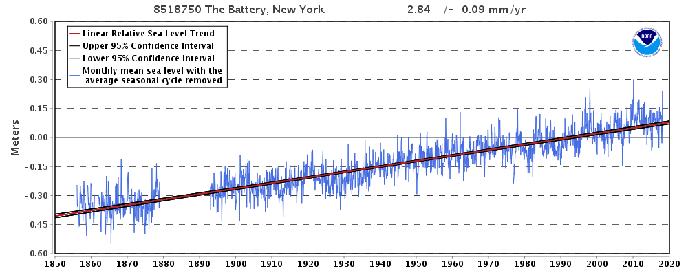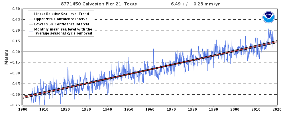 Finally, probably the worst case, and well-known to all already is Galveston, Texas: The water has been rising there for a long time, so maybe the models got this one close. The gap is less than the others since the rising trend is much higher, but the projection is still four times the past. Galveston is at risk, all right, but we didn’t need this analysis to tell us that.