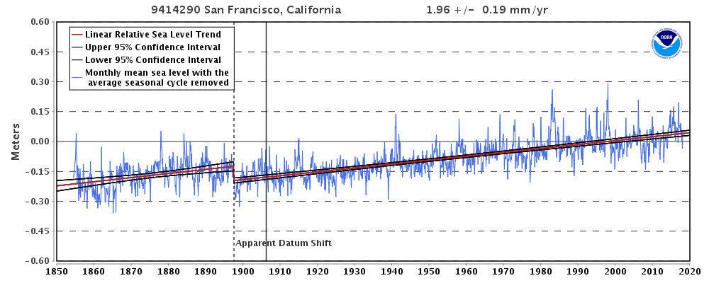 The graph displays three projections of mean sea level at San Francisco CA. The tidal gauge trend adds 0.2 meters (0.7 feet) by 2100. California Ocean Protection Council (COPC) has issued 2018 guidance on sea level rise along the California coastline. COPC takes IPCC models as gospel truth and projects future sea levels accordingly. The orange line represents COPC Medium-High risk aversion and produces 1.75 meters (5.7 feet) rise by 2100. The red line represents COPC Extremely High risk avoidance (worst case) resulting in 3.1 meters (10.2 feet) rise by 2100.