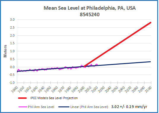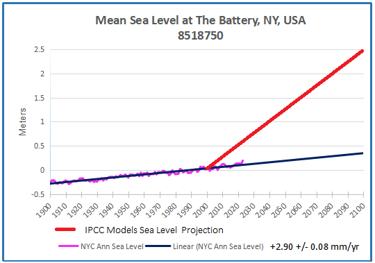 New York City is represented by the Battery tidal gauge: Again, a respectable record with a good 20th century coverage. And the models say: The red line projects 2500 mm rise vs. 284 mm, almost a factor of 10 more. The divergence is evident even in the first 17 years.