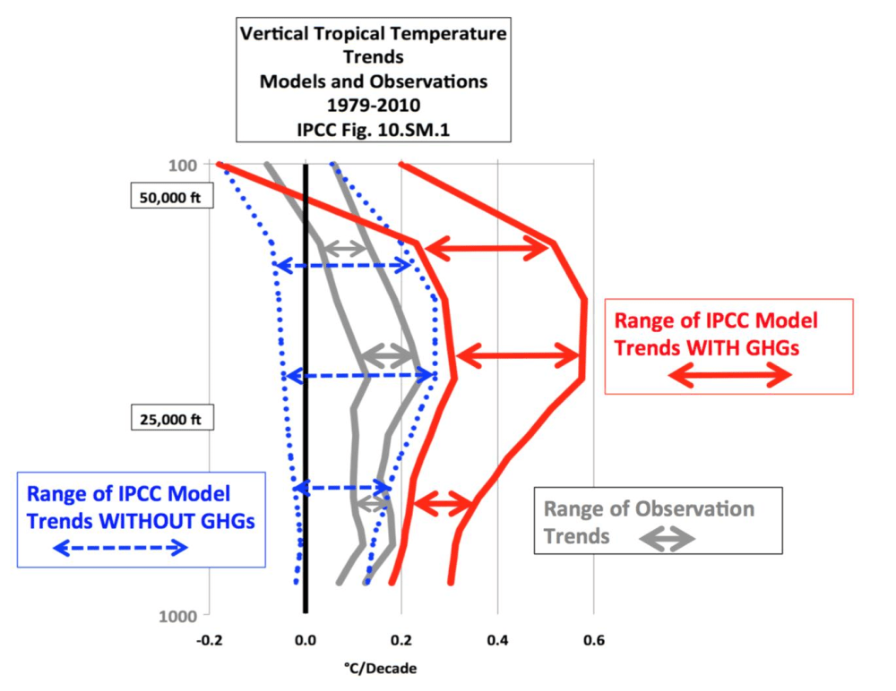 Figure 5. Simplification of IPCC AR5 shown above in Fig. 4. The colored lines represent the range of results for the models and observations. The trends here represent trends at different levels of the tropical atmosphere from the surface up to 50,000 ft. The gray lines are the bounds for the range of observations, the blue for the range of IPCC model results without extra GHGs and the red for IPCC model results with extra GHGs.The key point displayed is the lack of overlap between the GHG model results (red) and the observations (gray). The nonGHG model runs (blue) overlap the observations almost completely.