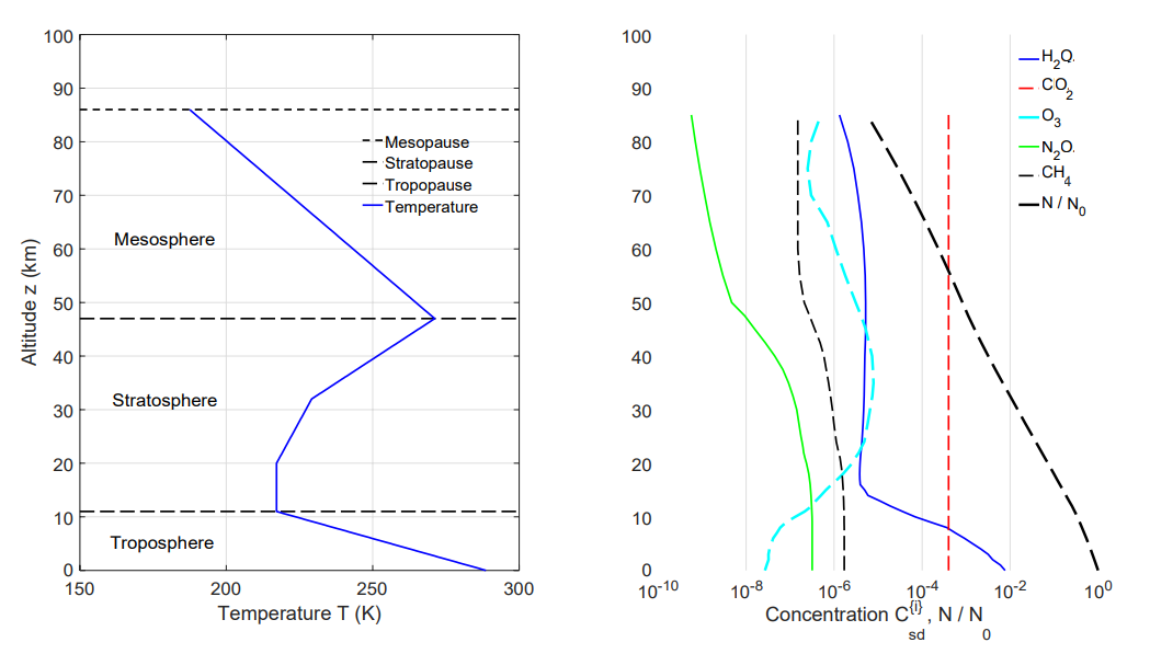 Climatologists look for the answer where the knowledge is better in the greenhouse effect. the culprits are certain gases that together make up 1% of the atmosphere. In this graph we can see the profile of the gases that make up the atmosphere in different colors showing their abundance on the lower axis with respect to altitude on the vertical axis the gases in the squares do not absorb in the infrared. Note that water vapor with a blue dotted line is very abundant near the surface but a thousand times less abundant in the stratosphere. The opposite is true for ozone with a purple dust line which is almost entirely in the stratospheric ozone layer. The thick black line is the temperature profile which in the troposphere has a positive lapse rate, that is the higher we go the colder it gets. This is fundamental to the greenhouse effect.
