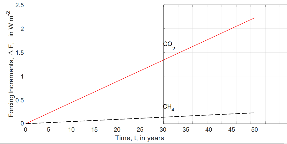 Then we have the “doubled CO2” (t1) scenario, where the ERL has been pushed higher up into cooler air layers closer to the tropopause: